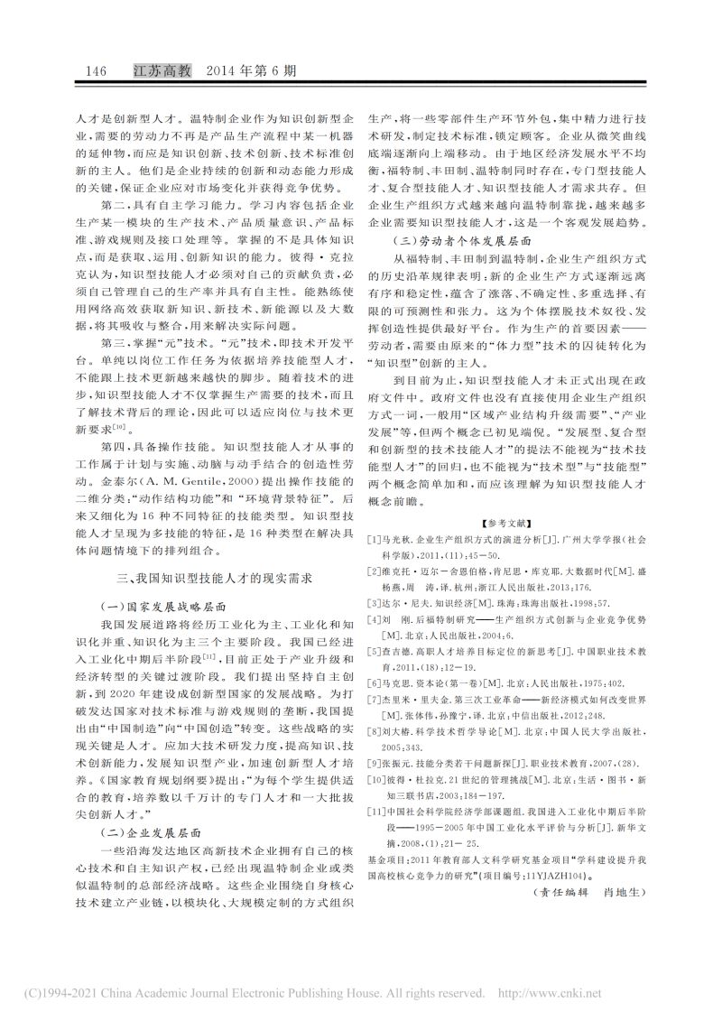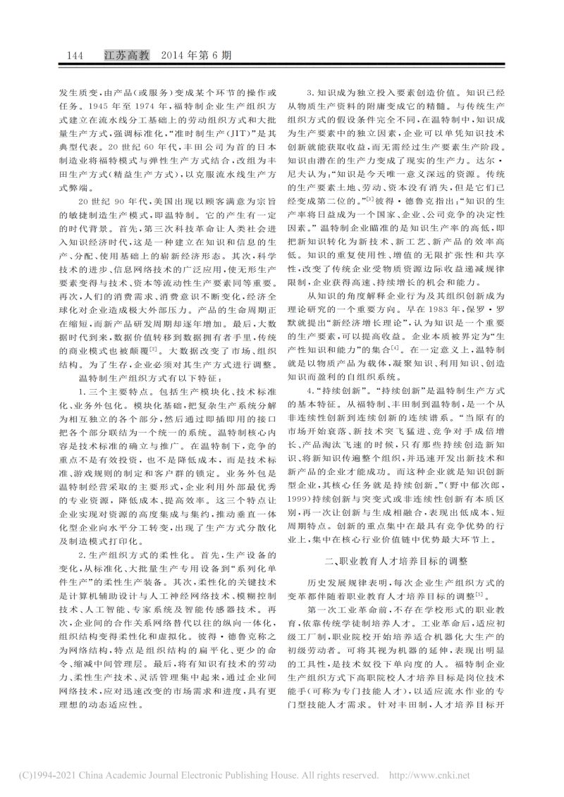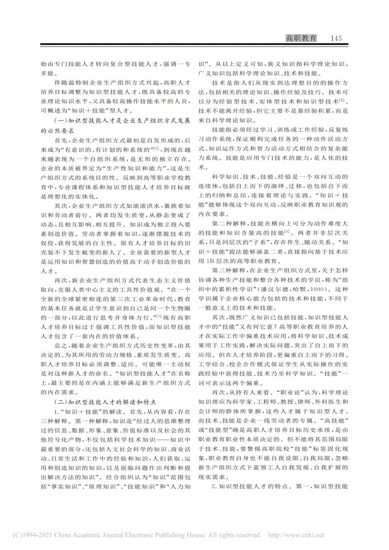 高等职业教育知识型技能人才培养目_省略_确立_企业生产组织方式变革的视角