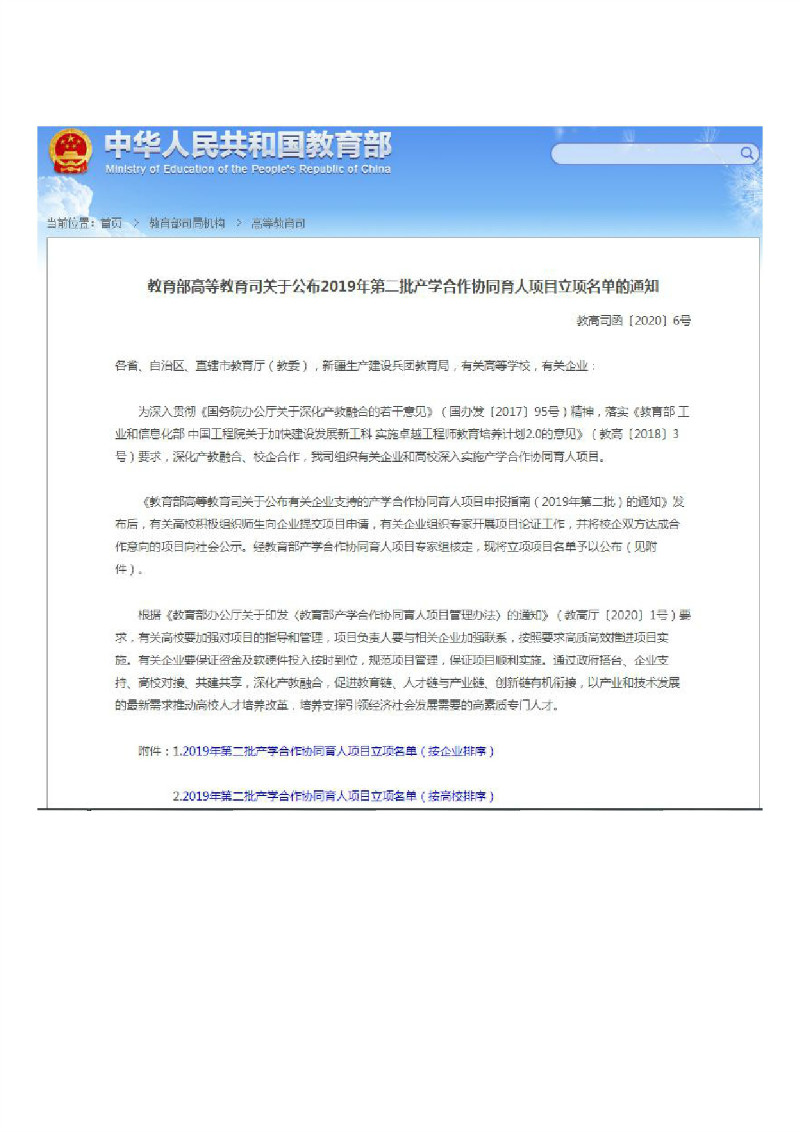 教育部高等教育司关于公布2019年产学合作协同育人项目立项名单
