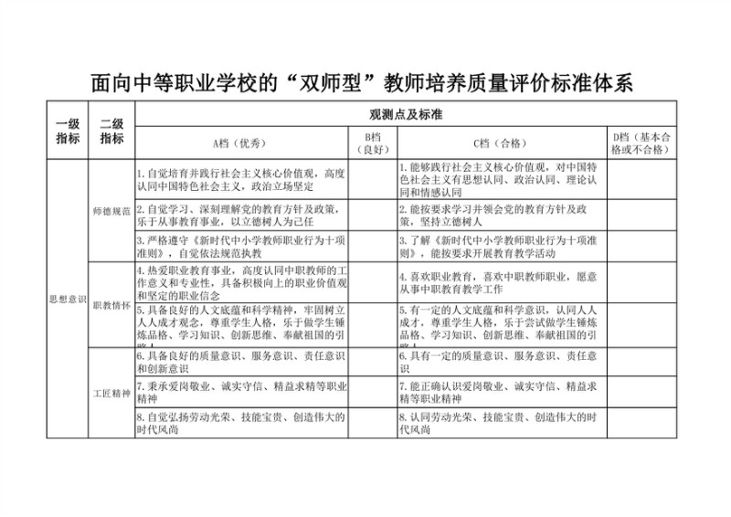 面向中等职业学校的“双师型”教师培养质量评价标准体系